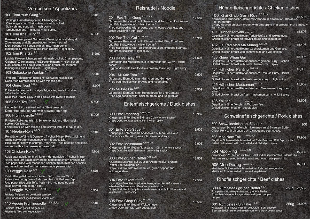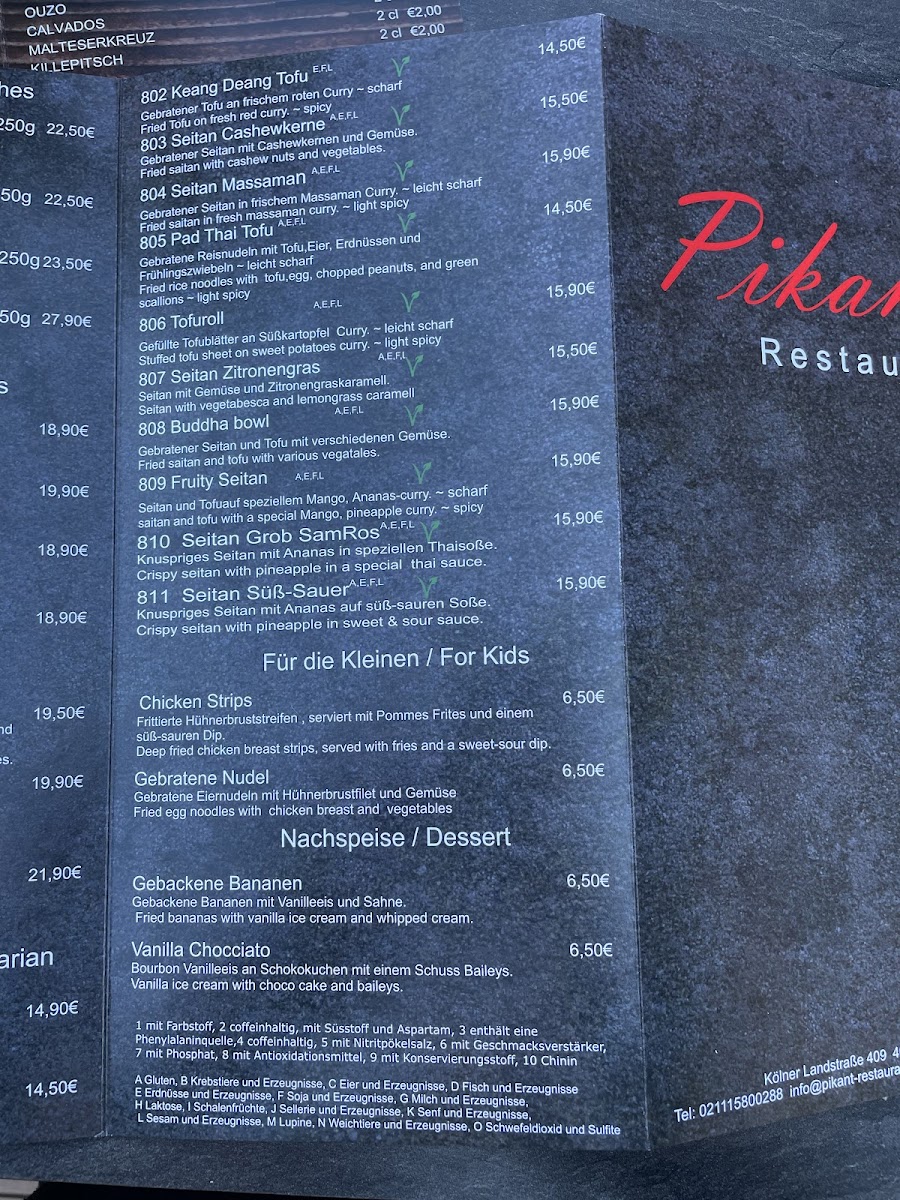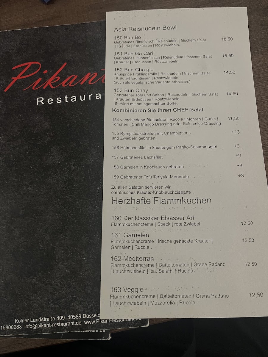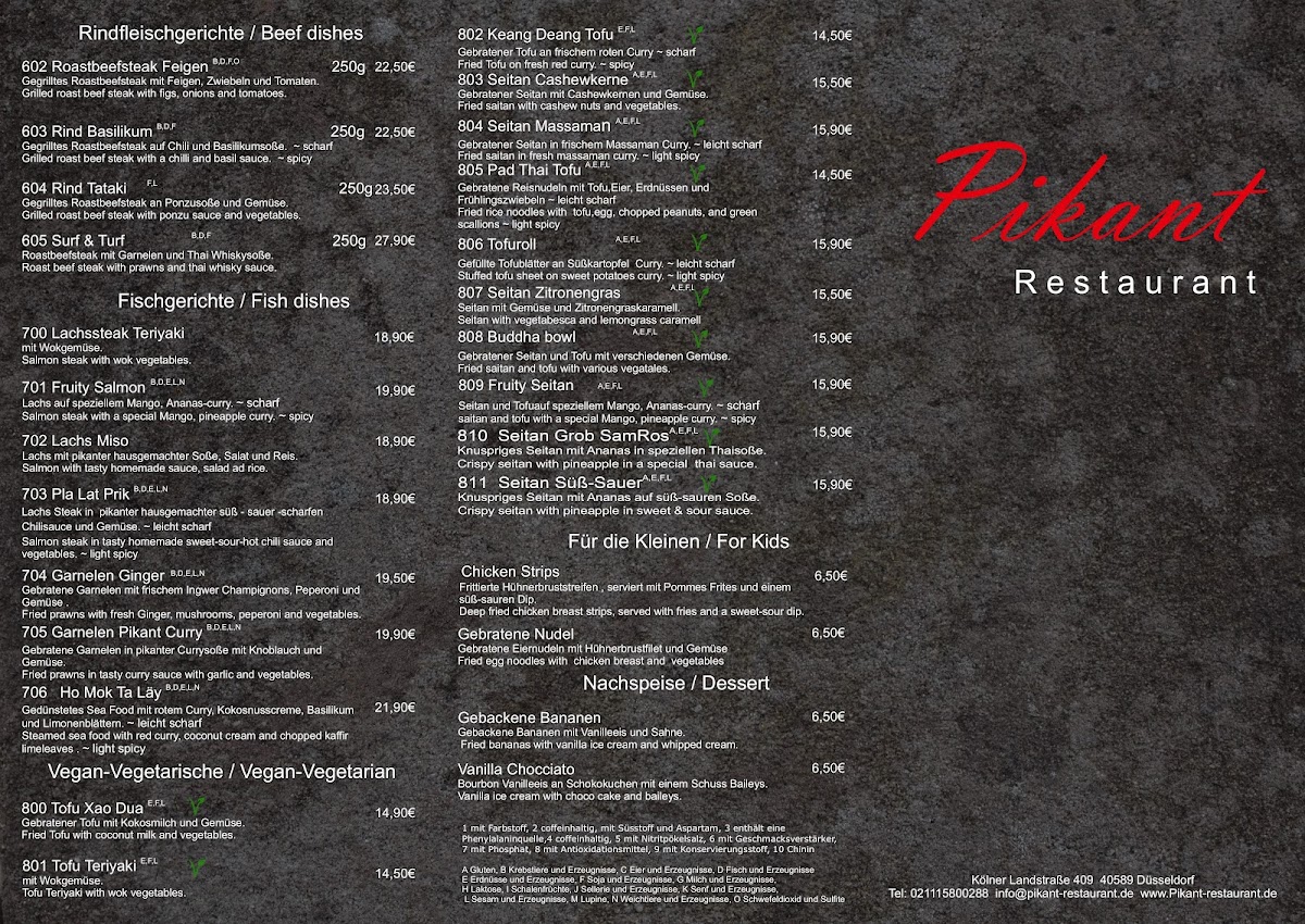 Pikant Restaurant offers a tantalizing fusion of flavors that promises an exciting dining experience. Among the standout dishes, the Hähnchen Panäng Penang Chicken is a must-try for those who enjoy a rich, aromatic curry. The dish is paired perfectly with a hint of spice, creating a memorable combination. The Sambuca serves as an excellent appetizer, offering a burst of flavor with every bite, while the Spring Roll adds a delightful crunch. For those craving something more indulgent, the Duck is expertly prepared, balancing tenderness with a crispy exterior. The Moo Nam Tok offers a flavorful, slightly tangy meat experience, showcasing the restaurant's mastery of bold, vibrant tastes. Vegetarians will enjoy the Phad Thai Tofu, a classic dish brimming with fresh ingredients and balanced flavors. On the drink side, the Strawberry Caipirinha&Singing Bamboo cocktail is a refreshing, fruity option that pairs well with the savory dishes. For a more adventurous option, the Enter Massaman is a great choice, with its rich, spiced sauce enveloping tender meat. The Cocktail Mai Tai is a crowd favorite, delivering a tropical kick that complements the diverse menu. The Chicken-rolle is another dish that stands out, offering a perfect combination of juicy chicken and flavorful spices. Lastly, the Surf And Turf is a luxurious choice, combining land and sea in one irresistible dish. Pikant Restaurant's menu expertly blends bold flavors, making it an unforgettable destination for anyone looking for a vibrant culinary experience.